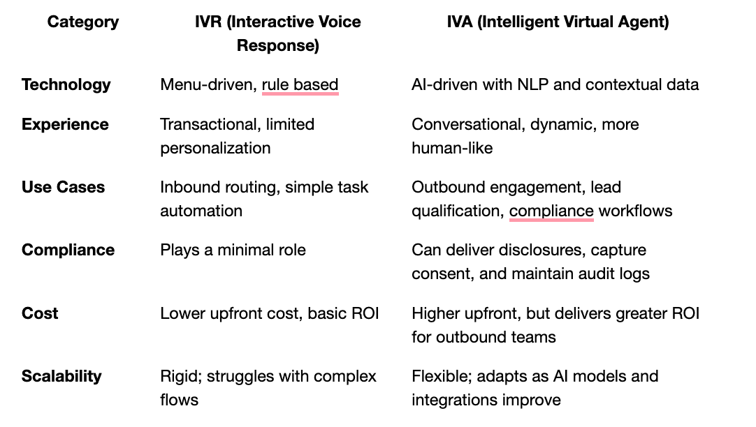 IVR (Interactive Voice Response) uses menu-based prompts to route calls and handle simple tasks, while IVA (Intelligent Virtual Agent) uses AI and natural language to carry on real-time conversations. IVR is best for basic inbound routing and self service, while IVA supports more complex inbound and outbound workflows like lead qualification, compliance, and personalized engagement. The right choice depends on your goals: IVR for simple, cost efficient automation; IVA for higher ROI, outbound performance, and stronger compliance.