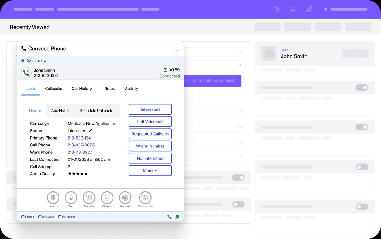 Unlike legacy CCaaS platforms that require agents to switch between systems, Convoso for Salesforce operates natively inside Salesforce via Open CTI. Agents stay entirely within Salesforce while the Convoso outbound campaign engine in the background, combining advanced dialing, compliance guardrails, and analytics without disrupting CRM workflows.