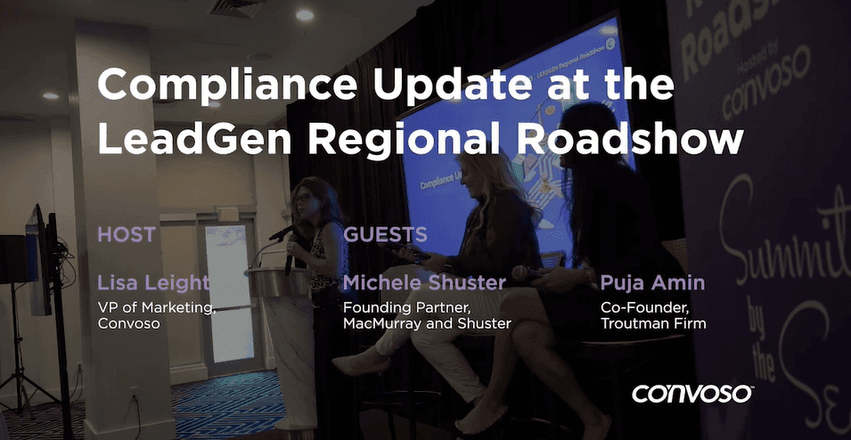 Lisa Leight, Convoso’s VP of Marketing, introduces the guests on the panel, two prominent compliance attorneys: Michele Shuster, Founding Partner at MacMurray and Shuster, and Puja Amin, Co-Founder at the Troutman Firm.